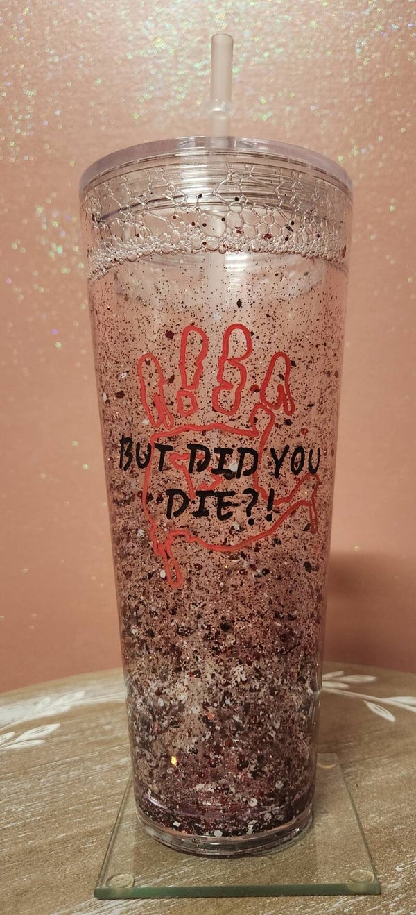 24 oz. Acrylic snowglobe tumbler engraved with a dripping hand print and the saying: But did you die?