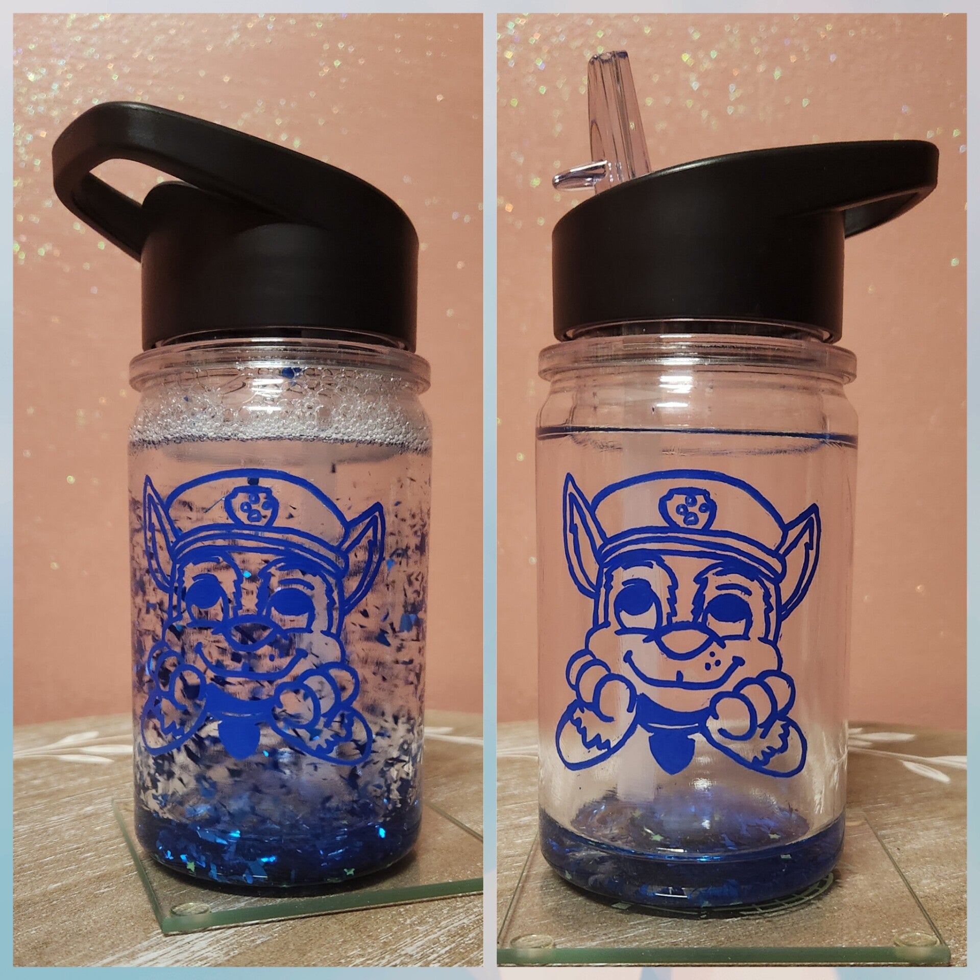 Acrylic kids size snow globe tumbler engraved with an image of one of your favorite pups. This cup comes with a no drip straw lid for your kid and is filled with chunky blue glitter and mini glow in the dark stars.
