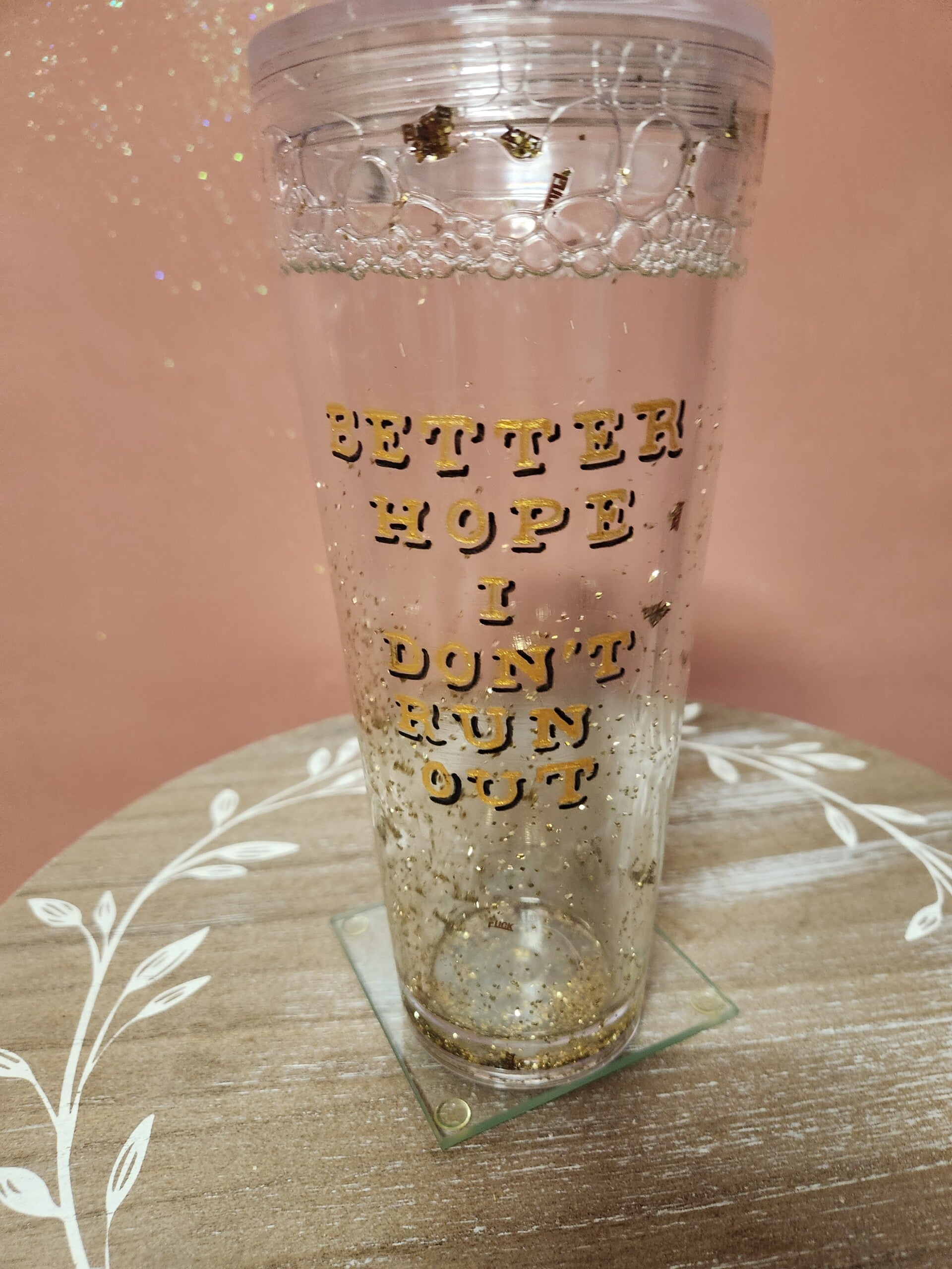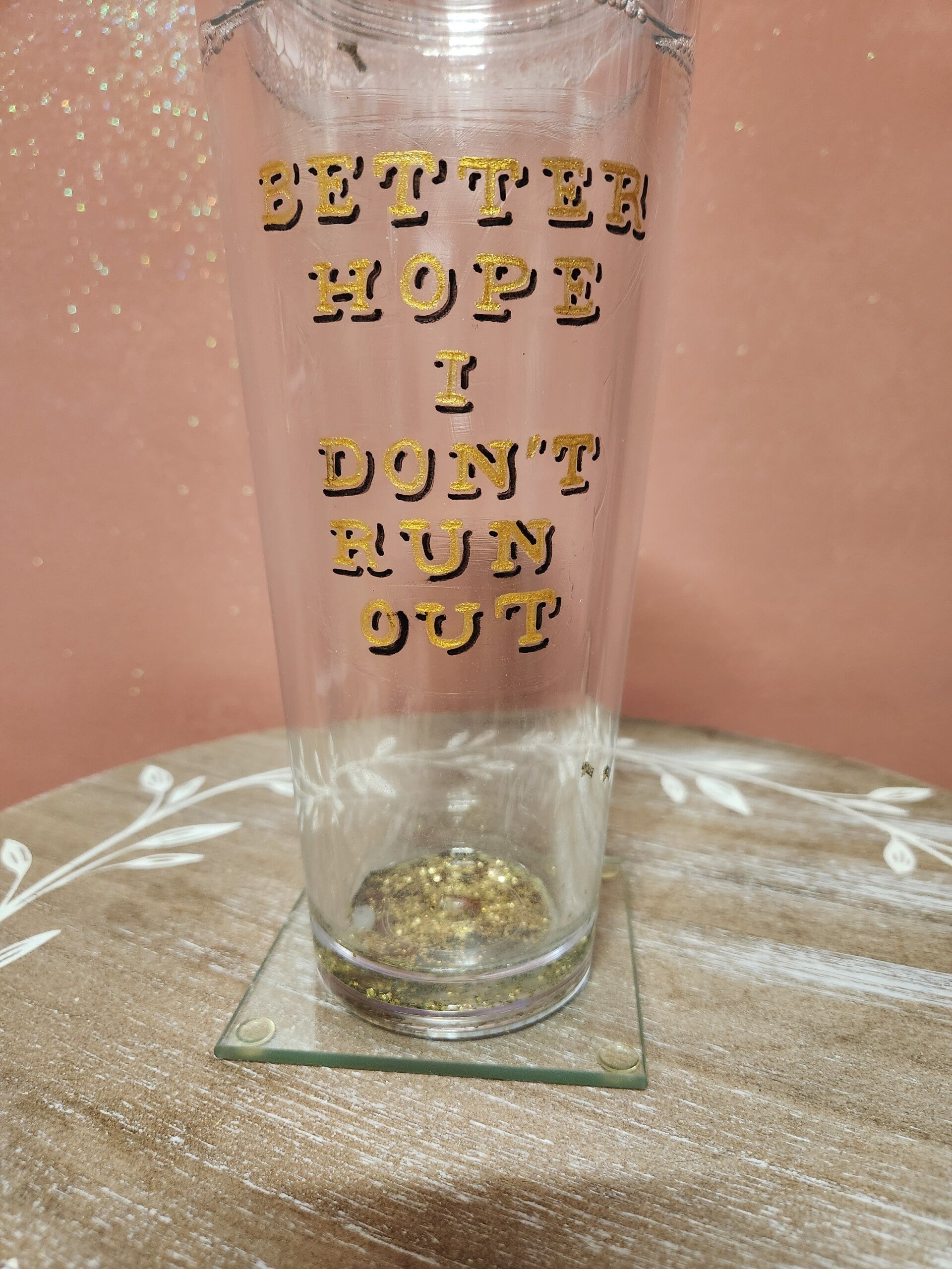 Tumbler engraved with the saying BETTER HOPE I DON'T RUN OUT and is filled with gold glitter along with tiny confettis that say F.U.C.K.